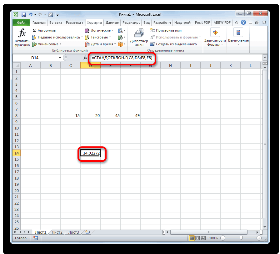 Для расчета можно извлечь корень из формул дисперсии, указанных чуть выше, но в Excel есть и готовые функции:
