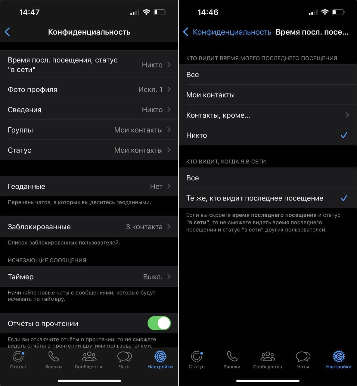 - Выберите «Никто», а ниже — «Те же, кто видит последнее посещение». Так вы будете сидеть в Ватсапе незаметно, но до тех пор, пока не прочтете сообщение.
