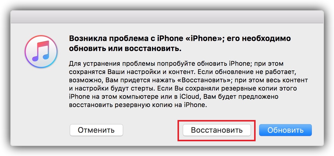 3. Когда iTunes предложит восстановить или обновить аппарат, нажмите «Восстановить» и следуйте дальнейшим подсказкам.