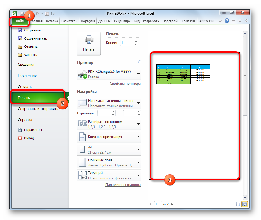 Прежде всего нужно выяснить, стоит ли вообще переворачивать документ. В данных целях можно воспользоваться предварительным просмотром. Для этого, перейдя во вкладку «Файл», перемещаемся в раздел «Печать». В левой части окна расположена область предварительного показа документа, как он будет выглядеть на печати. Если в горизонтальной плоскости он разбит на несколько страниц, то это означает, что таблица не поместится на лист.
