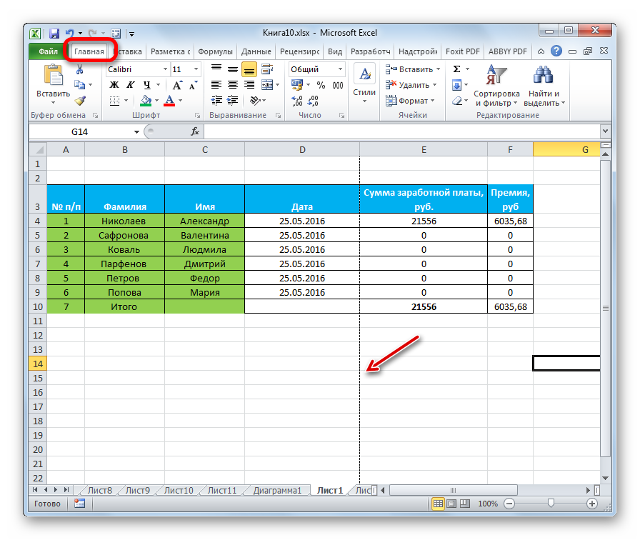 Если после этой процедуры мы вернемся во вкладку «Главная» то увидим пунктирную линию разделения. В случае, когда она вертикально разбивает таблицу на части, то это дополнительное свидетельство того, что при печати все столбцы на одной странице разместить не получится.