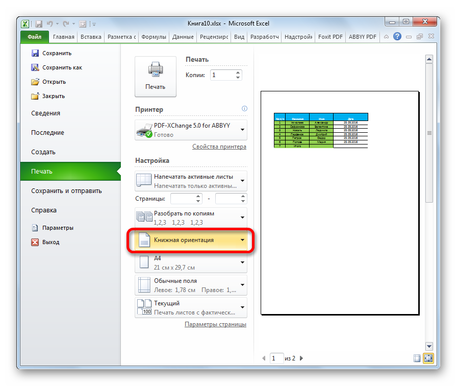 В приложении Эксель существует два варианта ориентации листов при печати: книжная и альбомная. Первая из них стоит по умолчанию. То есть, если вы не проводили никаких манипуляций с данной настройкой в документе, то при печати он будет выходить именно в книжной ориентации. Главное отличие этих двух видов позиционирования состоит в том, что при книжном направлении высота страницы больше ширины, а при альбомном – наоборот.