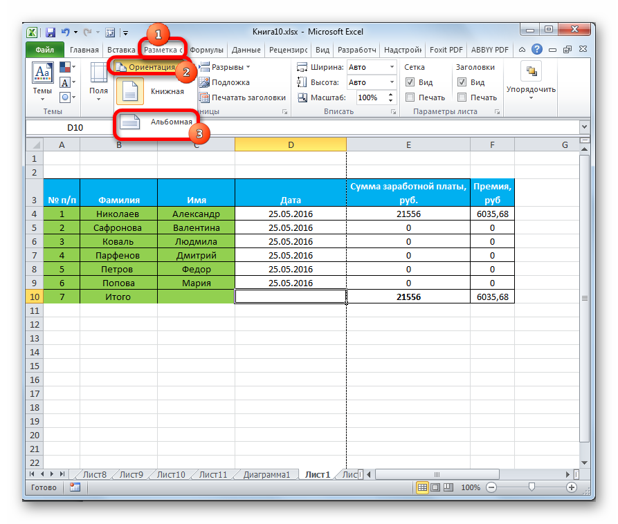 Из выпадающего списка выбираем пункт «Альбомная ориентация».