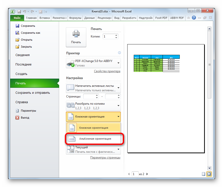 После этого ориентация страниц активного листа Excel будет изменена на альбомную, что можно наблюдать в окне для предпросмотра печатаемого документа.
