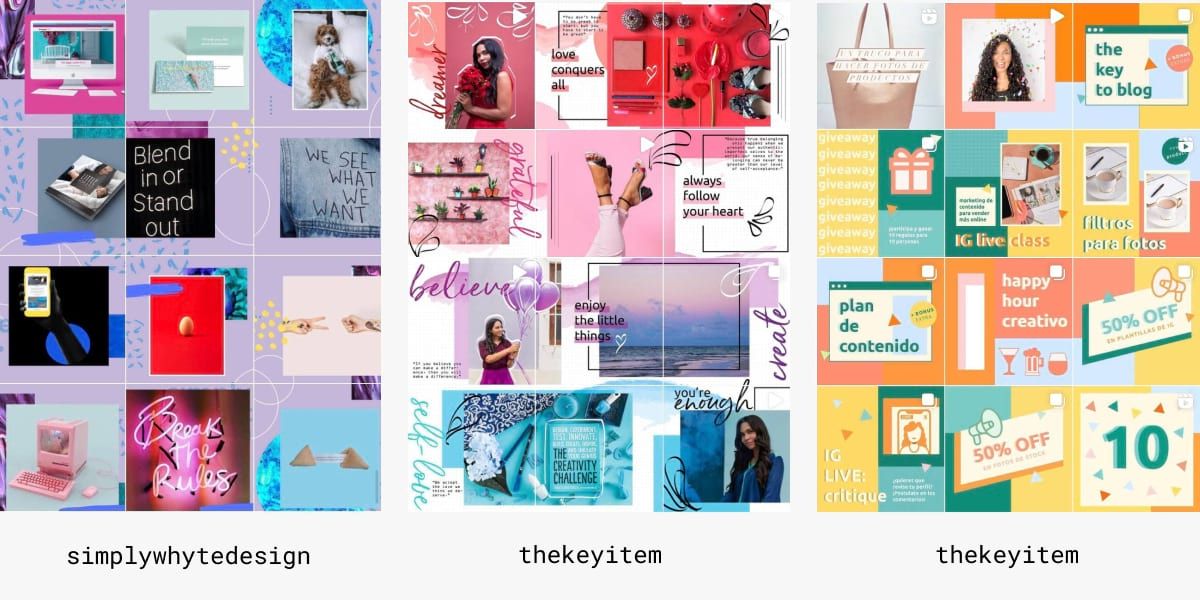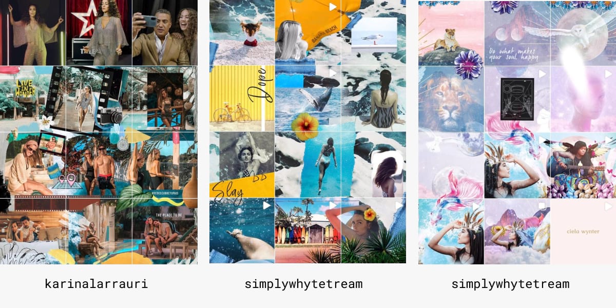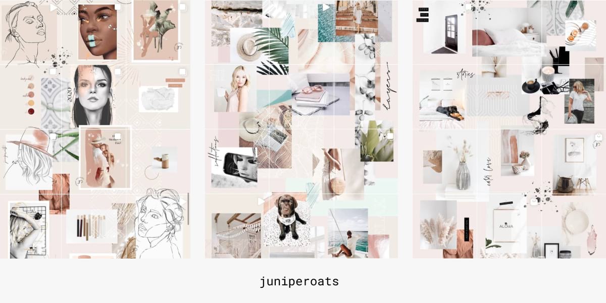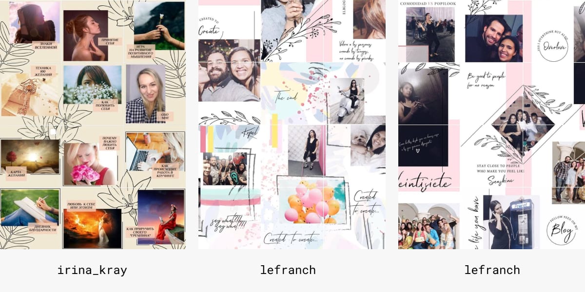 Стиль «коллаж» в дизайне актуален уже не первый год, и особенно интересно он выглядит в Инстаграм аккаунтах. Коллаж может отразить все интересы автора блога или детали бренда! При таком оформлении ленты авторам не нужно беспокоиться о том, чтобы в каждом посте было фото. Коллаж предполагает готовые фоны, плашки для заголовков постов и иногда рамки для фото.