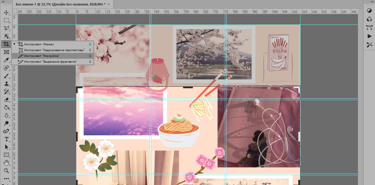 - Найдите на панели ножницы и выделите всю область новой фотографии, удерживая левую кнопку мыши. Щелкаем левой кнопкой мыши и разделяем фон на 9 частей.