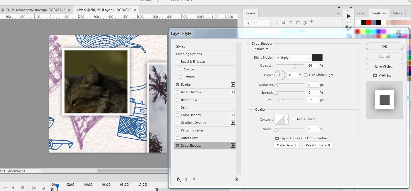 К слою с видео можем применить такие же стили, как и к обычному фону. Например, добавить обводку и тень.