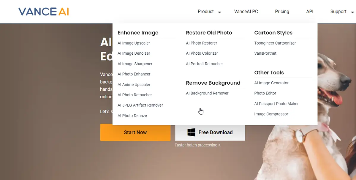 Ниже вы можете увидеть фантастический набор AI-усилителей, преобразователей и функций восстановления, которыми обладает VanceAI.