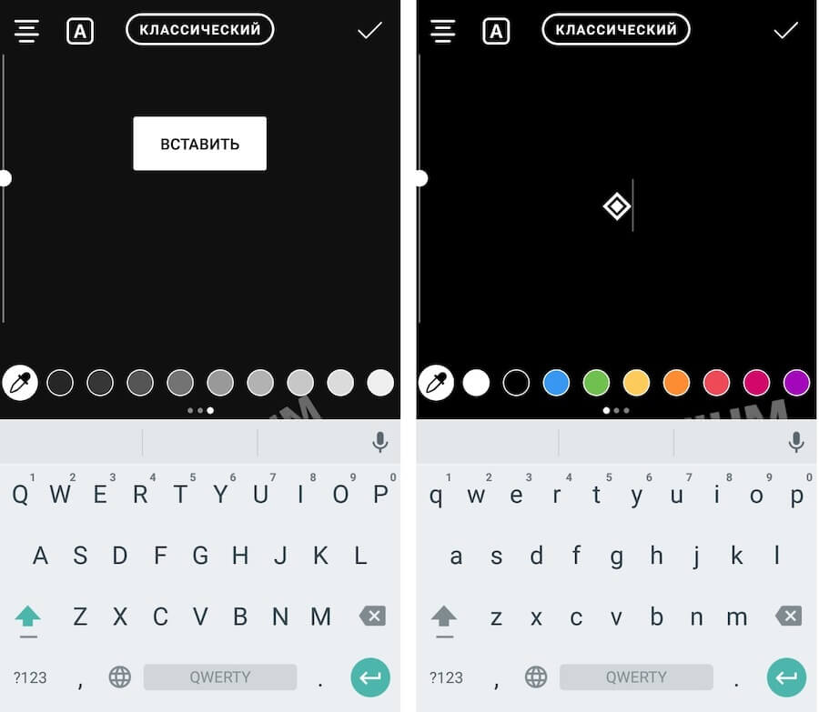 - Добавить текстовый блок в сторис. Выбрать функцию текст в виде иконки Аа, нажать на экран и подержать пока не появится надпись «вставить».