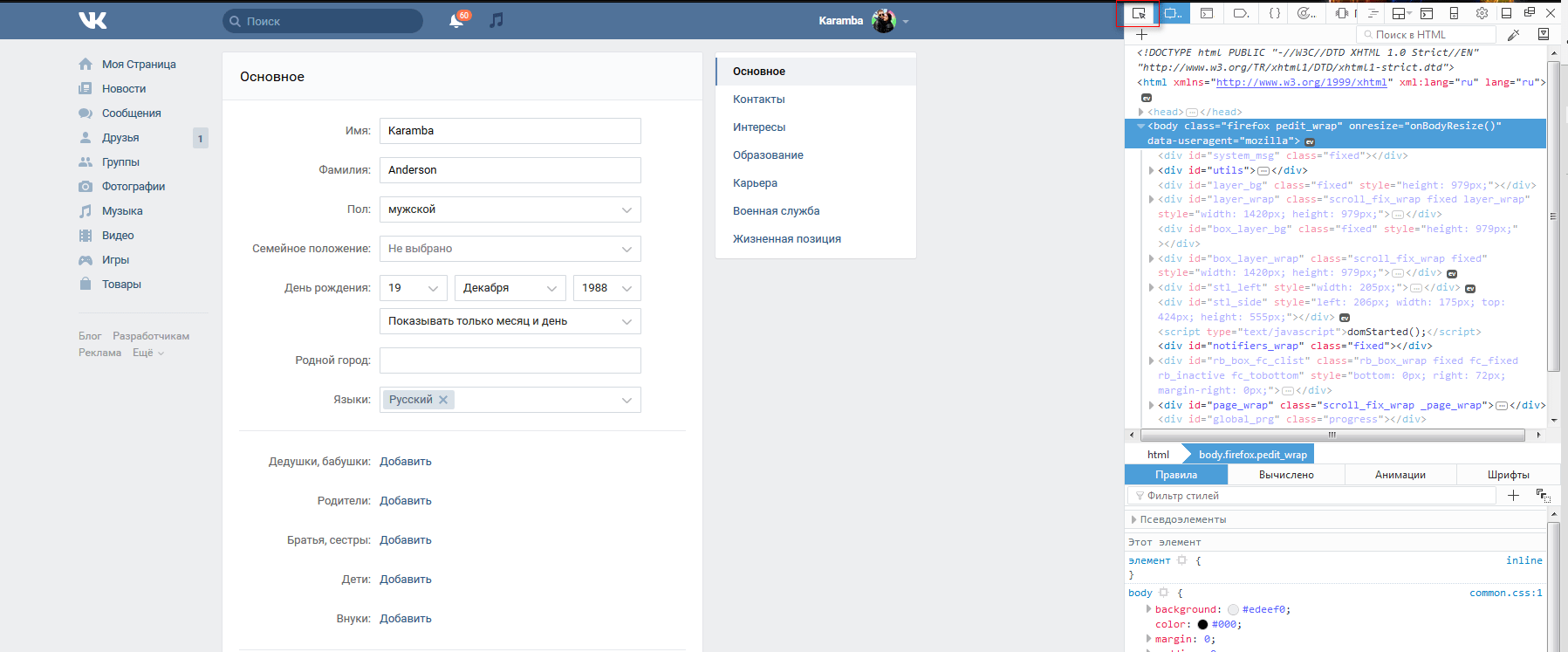 Для того чтобы разобраться, как поставить отчество в «ВК», перейдите на строчку с вашей фамилией. Кликните там правой кнопкой мышки, а затем выберите в открывшемся меню «просмотр кода элемента».Теперь мы будем с вами работать с тем, что у нас открылось. А именно — с так называемым кодом. Найдите строку Щелкните по ней правой кнопкой мыши, а затем выберите пункт «edit as HTML».