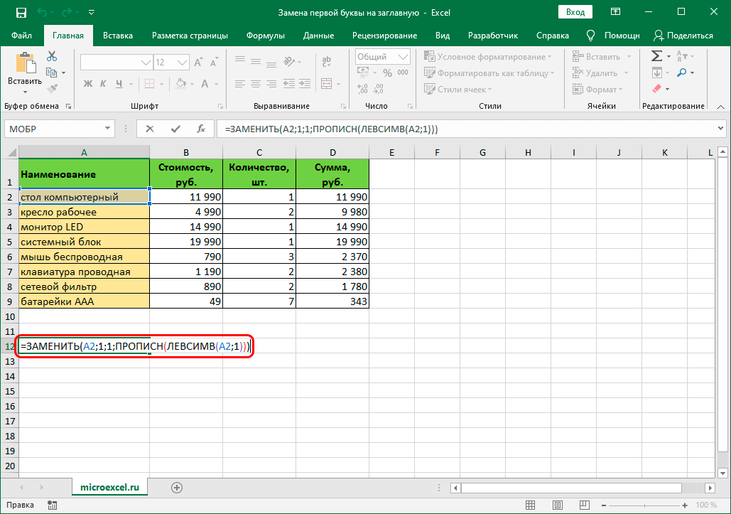Замена первой строчной буквы на заглавную в Excel
