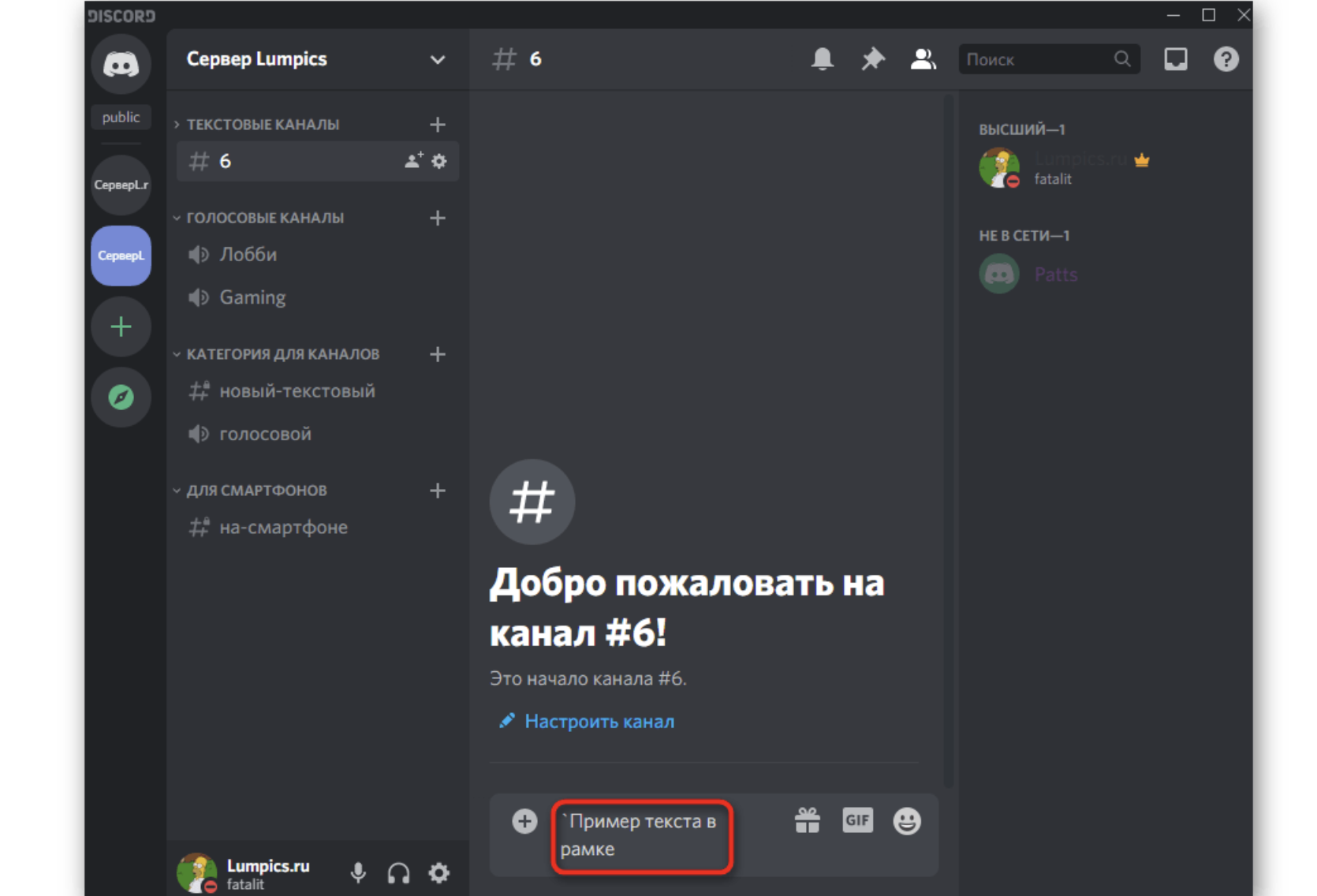 Выделение текста в Discord делается очень просто! Если инструкция вам непонятна, смотрите на примере. Хотим взять в рамку слово «Привет», поэтому пишем `Привет`. Дополнительные пробелы между кавычками и буквами не нужны.