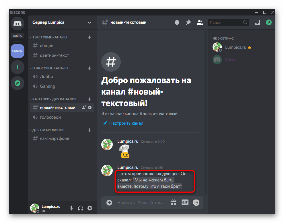 - После его отправки вы увидите, что сам текст теперь написан на более темном фоне. Да, это нельзя назвать полноценной рамкой, но для акцента сгодится. Тем более, вы можете вместе с этим добавить курсив, перечеркнуть надписи или сделать их жирными, комбинируя все доступные варианты форматирования, поддерживаемые в десктопной версии Дискорда.