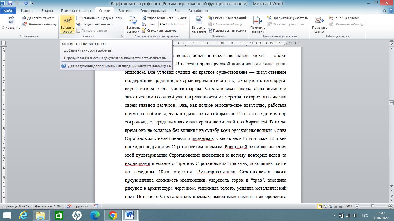 - В меню “Ссылки” выберите команду ”Вставить сноску”.