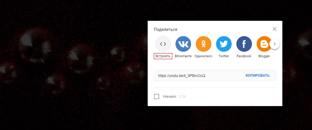 Самой первой кнопкой в списке будет Встроить. Нажмите на ее, чтобы вставить видео с Youtube на сайт.