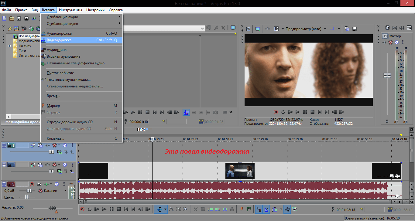 Для начала помещаем своё видео на «таймлайн» и сразу же создаём новую видеодорожку: кликаем правой кнопкой по текущей дорожке и в появившемся меню выбираем «Вставить видеодорожку»