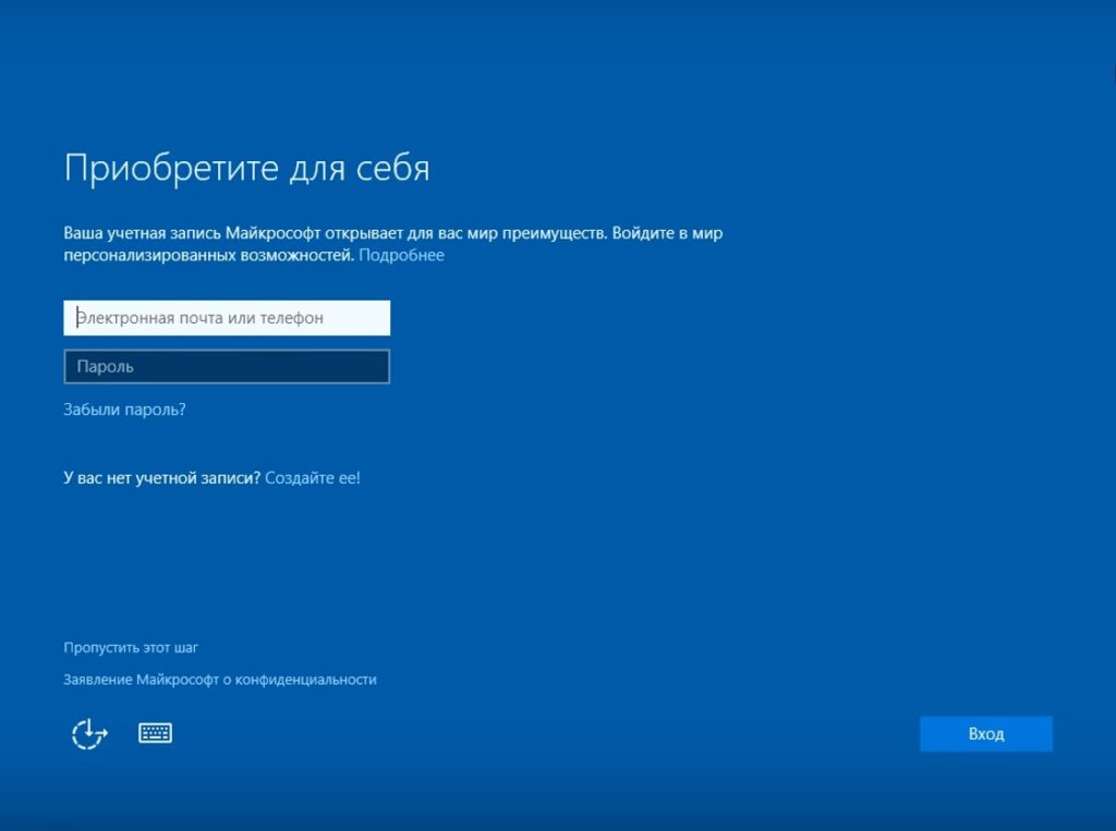 Далее появится последнее окно настроек. Здесь пользователю предлагают создать учетную запись Microsoft. Это на самом деле, как бы краеугольный камень, потому что если эту запись все-таки создать, то все личные данные и все настройки будут привязаны к этой записи.