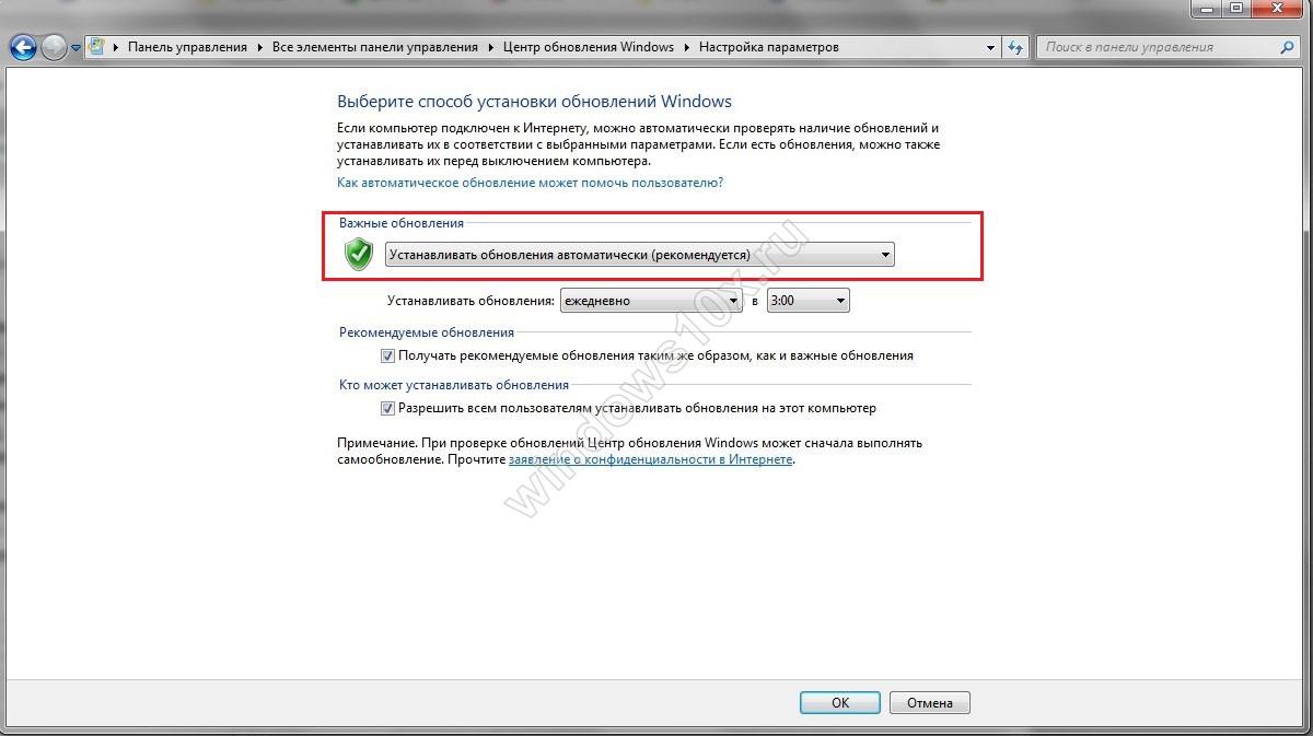 - Убеждаемся, что в поле «Способ получения обновлений» установлено «Получать обновления автоматически». Если это не так – меняем и жмем ОК.