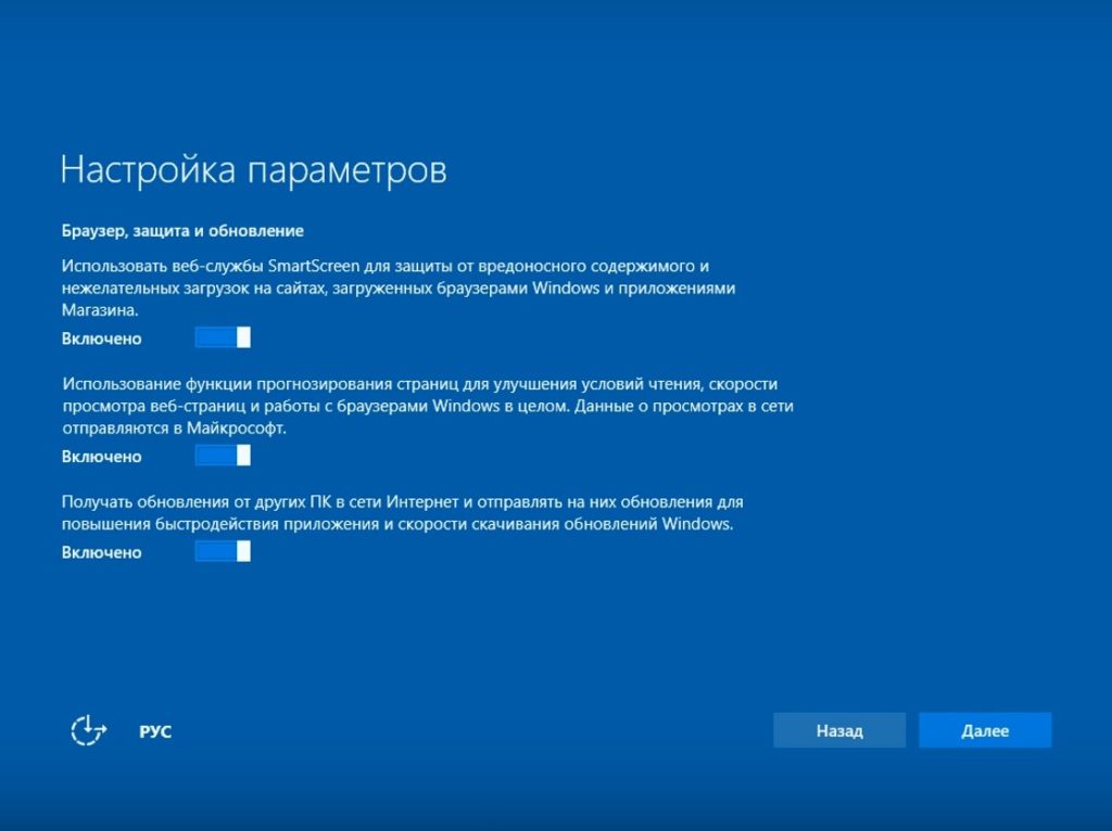А вот и SmartScreen – та самая служба, которая частенько бывает одной из причин замедления Windows 10, в обмен на так называемую «безопасность» и «защиту». Здесь же присутствует и второй пункт – «Прогнозирование страниц», который разрешает официально шпионить во время серфинга в интернете, а третий пункт про обновления ПК – самый интересный. Он задействует на системе подобие торрент-клиента, скачивающего и раздающего обновления по сети. Естественно это сказывается на скорости интернета, задержке сигнала в онлайн-играх и прочем. Здесь снова нужно все ползунки выключить и нажать «Далее».