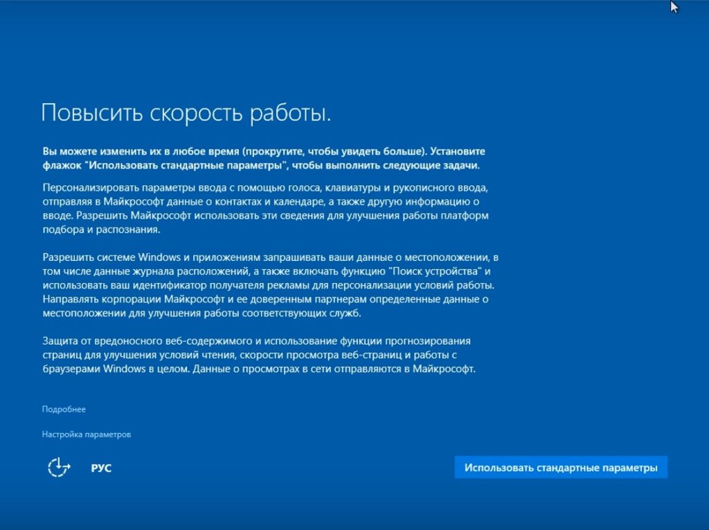 После установки Windows 10 появляется первое окно окончательной подготовки к использованию. Здесь не стоит поддаваться соблазну, нажимая большую кнопку «Использовать стандартные параметры», это равносильно согласию на нарушения всех своих прав приватности и анонимности. В левой части экрана есть неприметный пункт, написанный мелким бледным шрифтом «Настройка параметров». Именно с него все и начинается.