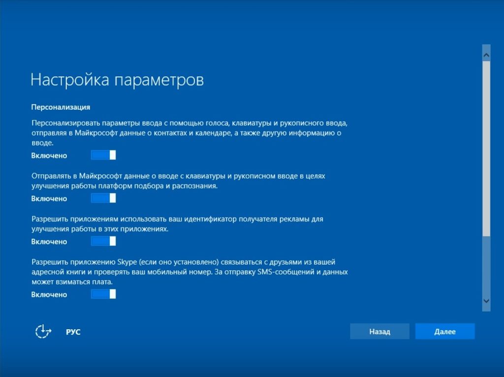Так же как и на предыдущем шаге, здесь необходимо сдвинуть все ползунки в состояние «Выключено» и снова нажать «Далее».