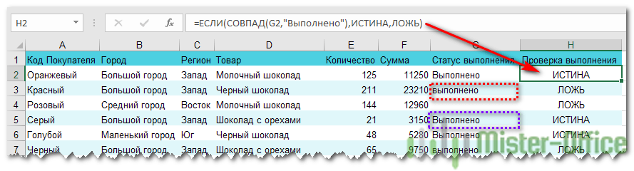 Функция СОВПАД сравнивает два текста и возвращает ИСТИНА в случае их полного совпадения, и ЛОЖЬ — если есть хотя бы одно отличие, включая регистр букв. Поясним возможность ее использования на примере.