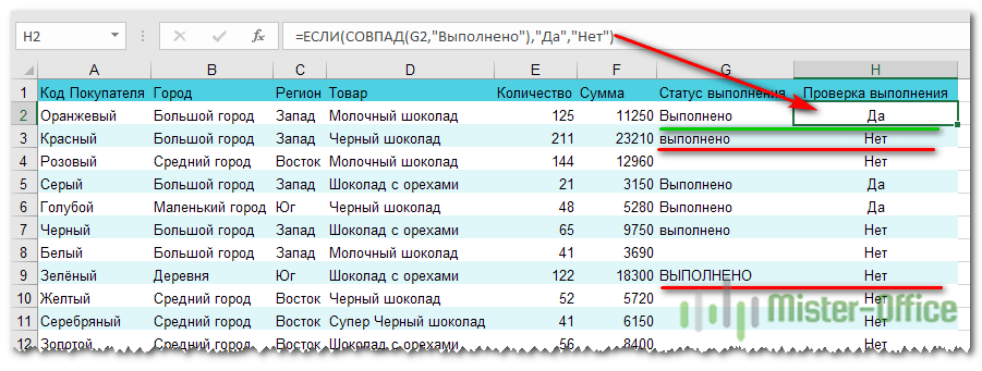 Как видите, варианты «ВЫПОЛНЕНО» и «выполнено» не засчитываются как правильные. Засчитываются только полные совпадения