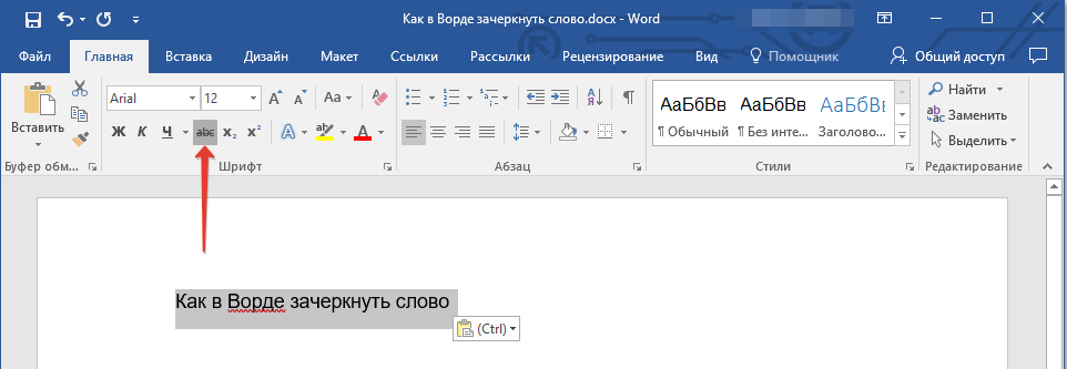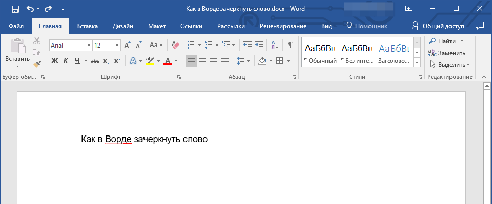 Проще всего сделать перечеркивание в популярном текстовом редакторе Microsoft Word. Если вы переключитесь на вкладку «Главная» и внимательно изучите содержимое раздела «Шрифт», то найдете там маленький значок abc . Выделите любой участок текста в Ворде, нажмите этот значок, и текст тут же станет перечеркнутым.