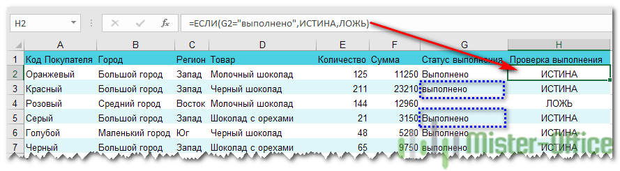 Формула проверки выполнения заказа в столбце Н может выглядеть следующим образом: