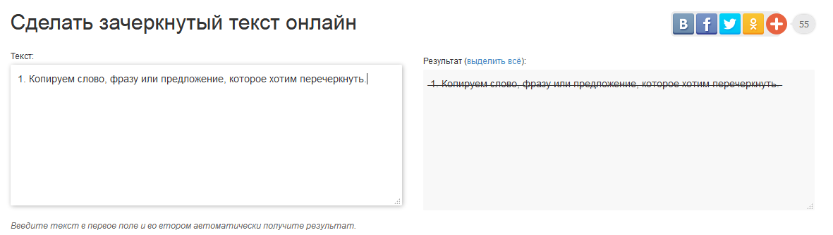 Если неохота форматировать слова и фразы вручную, можно воспользоваться онлайн-генератором. Он работает так: вы вставляете словосочетания в одном поле, а в другом программа выдает текст, где уже подставлена комбинация «̶» перед каждым символом.