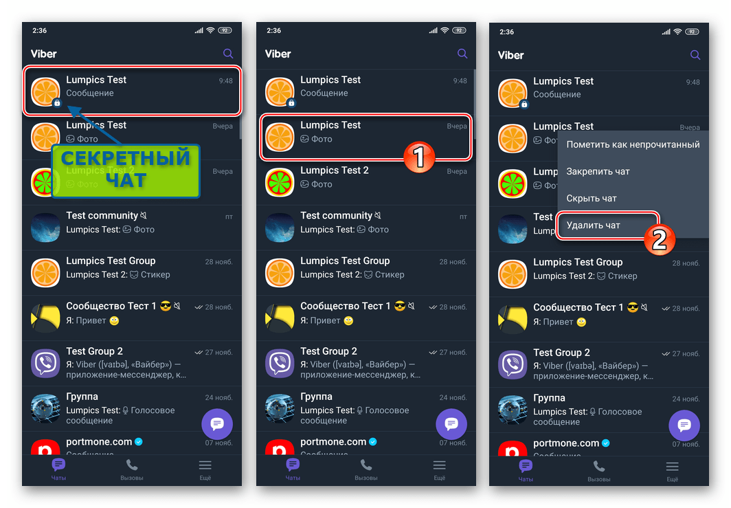 во вкладке «Чат» мессенджера очень легко отличить приватный разговор, созданный в Viber, от обычного: аватар собеседника рядом с его именем в списке диалогов и групп отмечен значком «Замок». Если вы планируете использовать только секретный чат, вы можете удалить обычный чат.