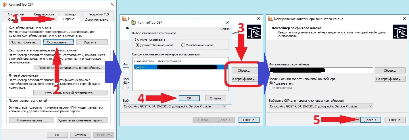 Откроется окно «Контейнер закрытого ключа», в нем нажмите на кнопку «Обзор» и выберите сертификат, который необходимо скопировать.