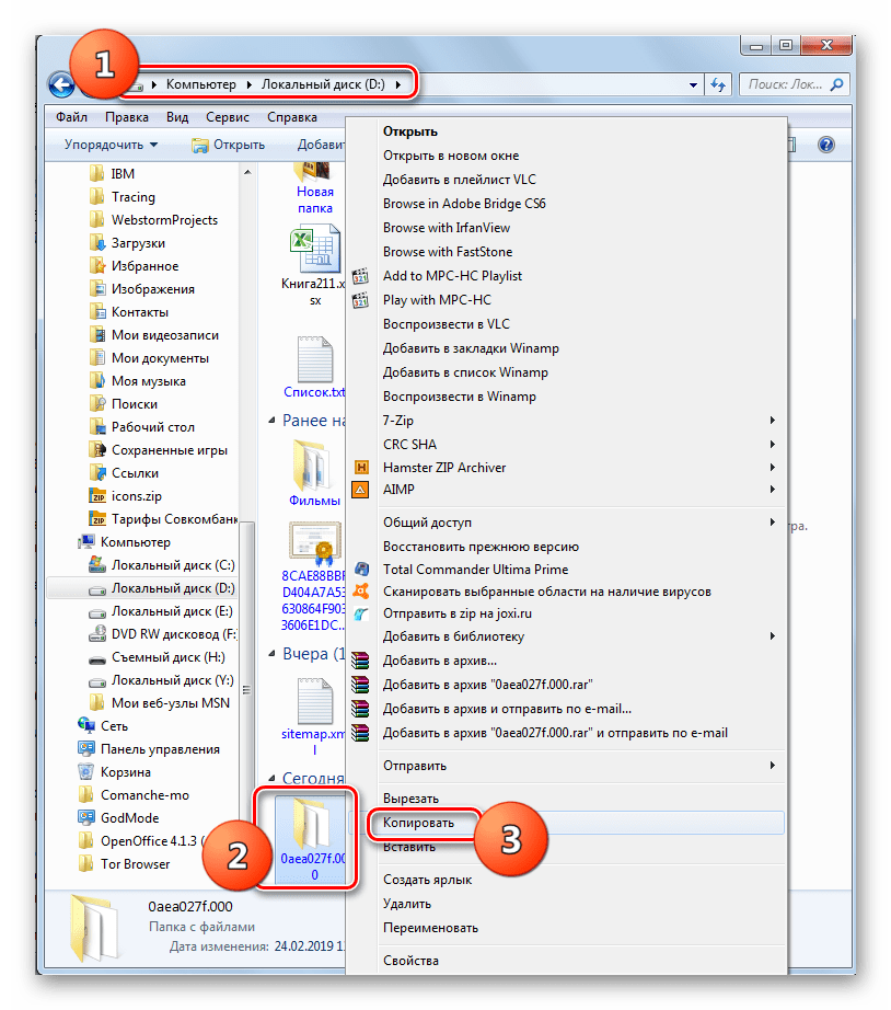 - Подключите USB-носитель к компьютеру. Откройте «Проводник Windows»и переместитесь в ту директорию, где расположена папка с закрытым ключом, который требуется скопировать на флешку. Щелкните по ней правой кнопкой мыши (ПКМ) и из раскрывшегося меню выберите пункт «Копировать».