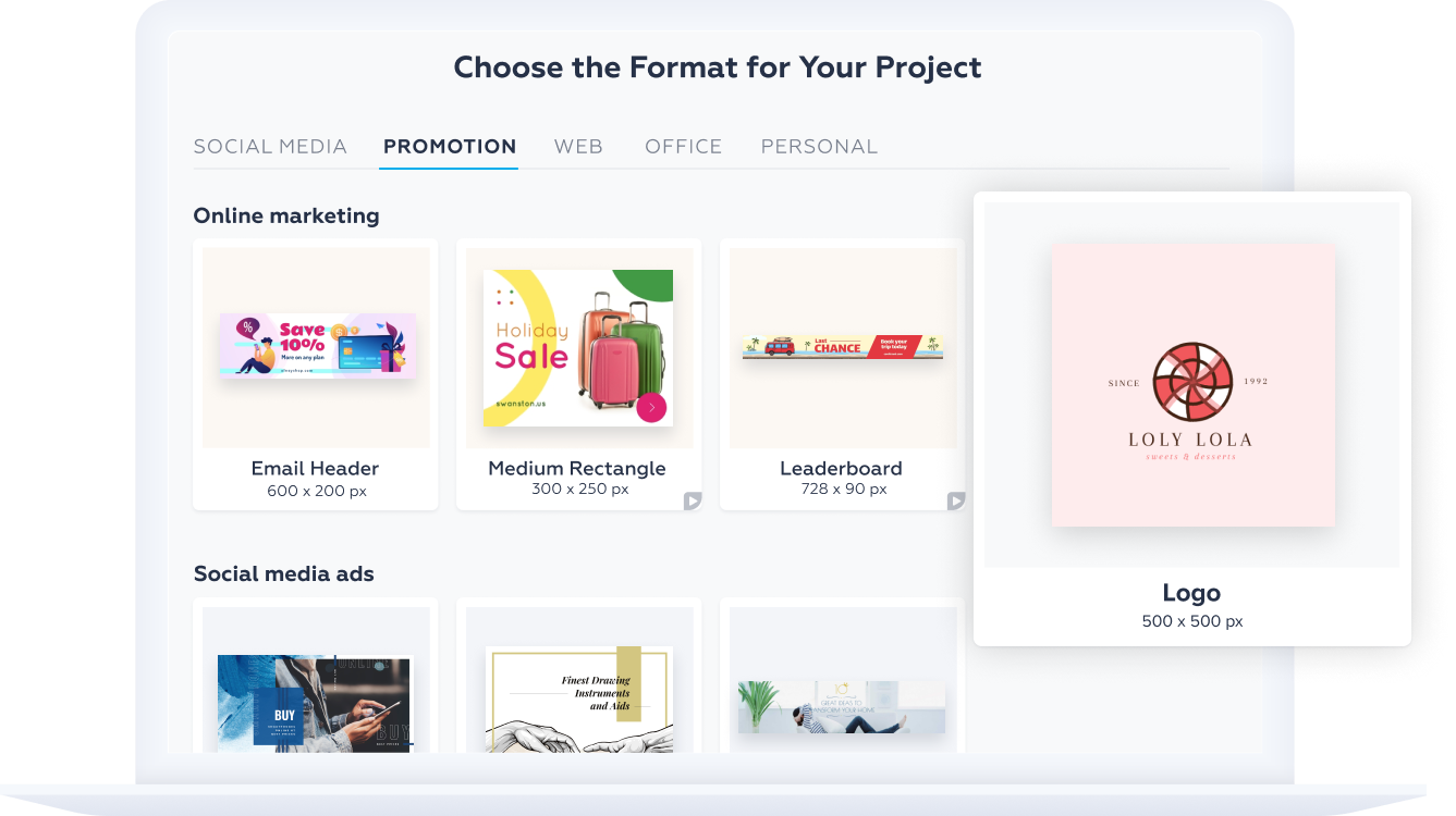Найдите формат «Логотип» на главной странице в разделе «Форматы» или перейдите в раздел «Реклама» — там вы найдете два формата логотипа.