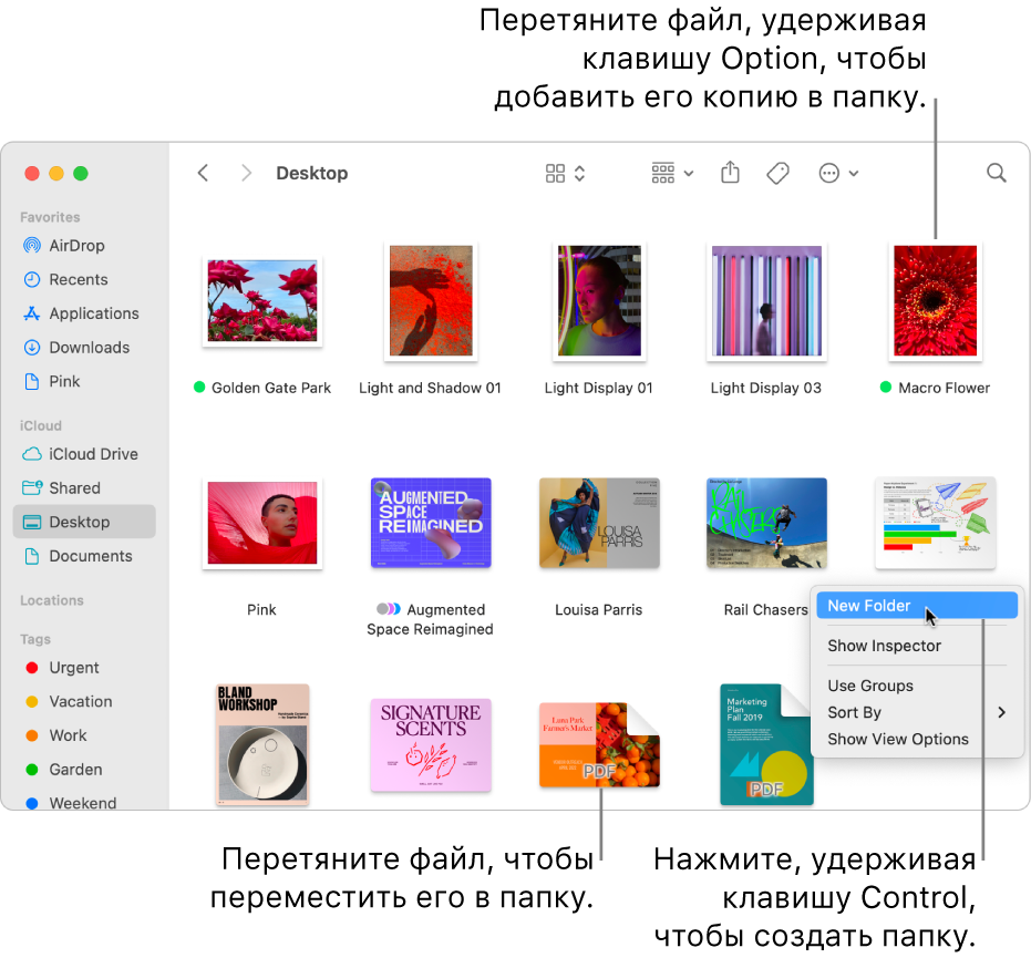 Вы можете быстро создать папку, объединив в нее объекты на рабочем столе или в окне Finder.