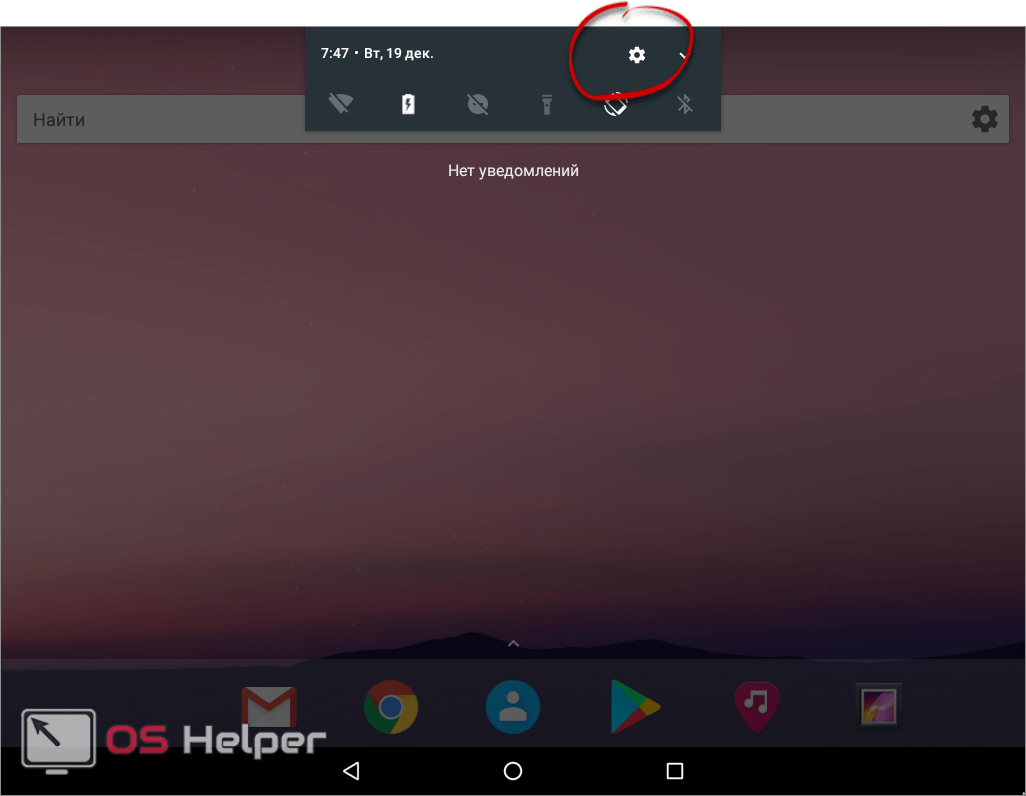 - Первым делом заходим в настройки, сделать это можно с помощью главного меню или через строку уведомлений, как показано на скриншоте: