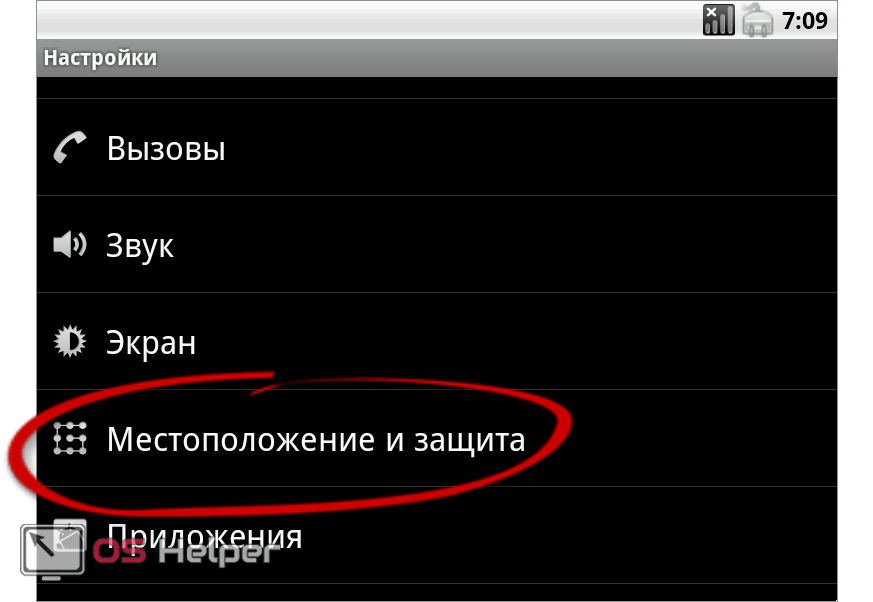 - Отыскать и развернуть вкладку «Местоположение и защита». В зависимости от модели он может называться «GPS и безопасность»;