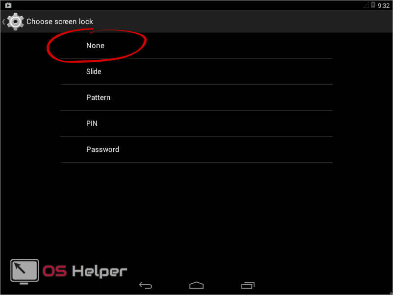 - Как и в других версиях андроида, перед отменой блокировки потребуется ввести существующий пароль, возможно графический ключ, после чего система позволит отключить блокировку.