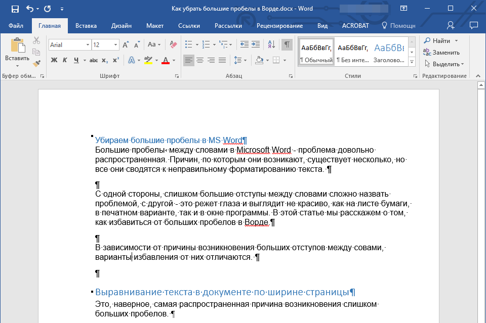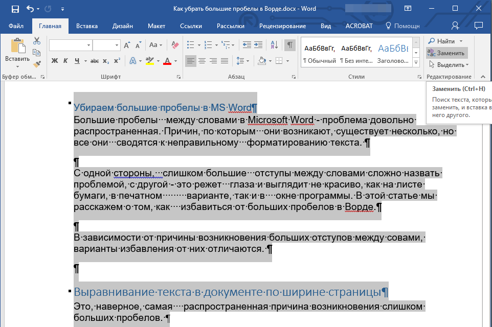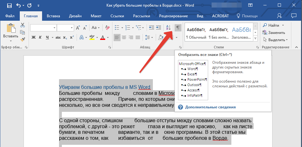 Первое что требуется сделать запустить показ непечатных символов во вкладке «Абзац». При наличии лишних пробелов между словами будет стоять больше одной черной точки. Исправить сложившуюся ситуацию можно вручную убрав лишние знаки или воспользовавшись автоматической заменой по всему тексту.