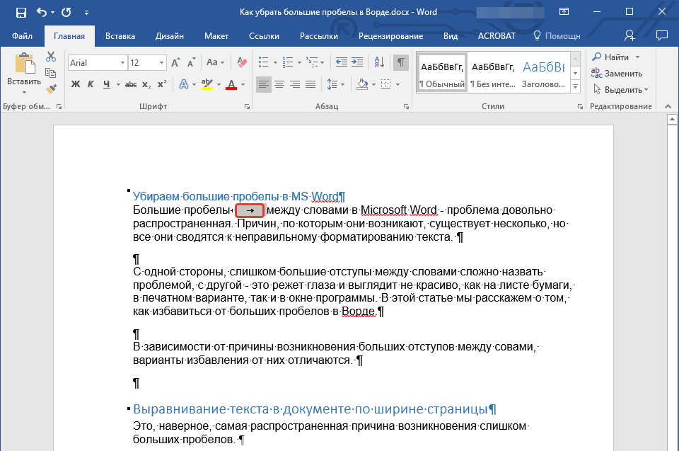 Случается, что документ имеет определенный нормы форматирования, такие как равнение по ширине. В таком случае длинный промежуток может возникать в конце той или иной строчки. Первое что требуется сделать, это включить отображение всех символов, что поможет выявить наличие значка «Конец абзаца».