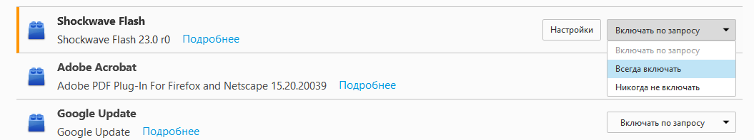 В Mozilla Firefox финальное окно находится во вкладке «Дополнения», пункт «Плагины». Обычный Flash носит немного другое название, а именно «Shockwave Flash». Из интерактивного меню справа выбираем «Всегда включать».
