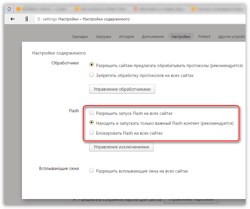 Настройка автоматического запуска Flash Player для Яндекс.Браузера