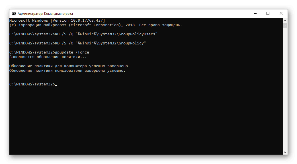 Когда команда прописана, нажмите Enter, и с компьютера будут удалены общие правила групповой политики пользователей.