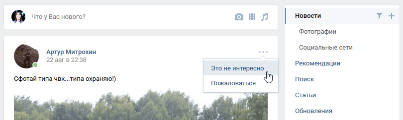 - Зайдите в раздел “Новости” и найдите запись человека, которого вы хотите убрать из важных. Если человек редко что-то публикует – зайдите на его страницу и выберите любую запись.