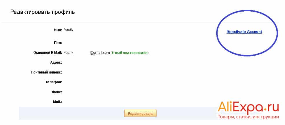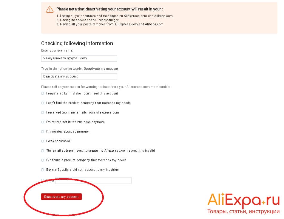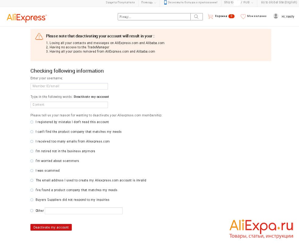 После всех заполненных полей в низу вашего экрана имеется красная кнопка с надписью «Deactivate my account«, нажав на которую ваша страница будет удалена безвозвратна. Сразу же исчезнут все заказы, бонусные баллы, переписки, ваши счета. Перед самим удалением страницы не забудьте еще раз осведомиться, нет ли у вас заказанных и еще не доставленных посылок, все диспуты завершены. После удаления страницы, вы уже не сможете проконтролировать получение товара, задать вопрос продавцу или открыть диспут.