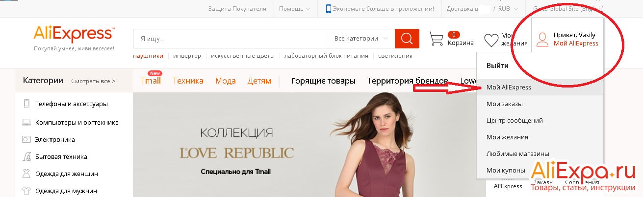Используя любой браузер перейти на главную страничку Алиэкспресса по адресу https://ru.aliexpress.com
