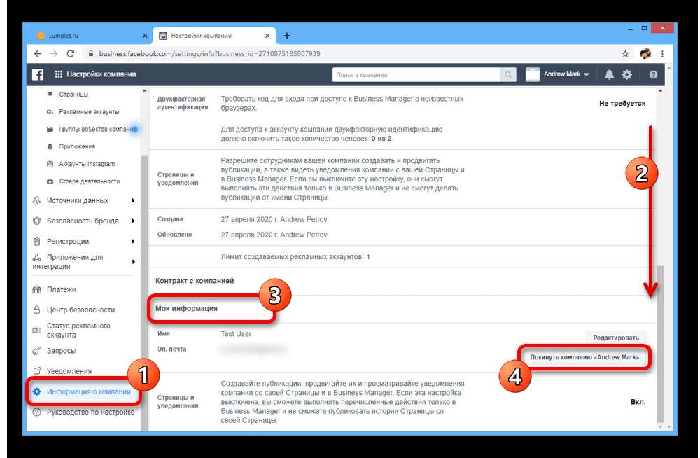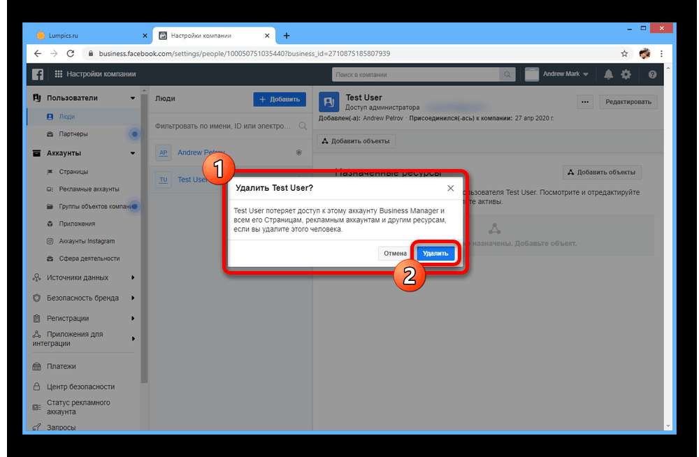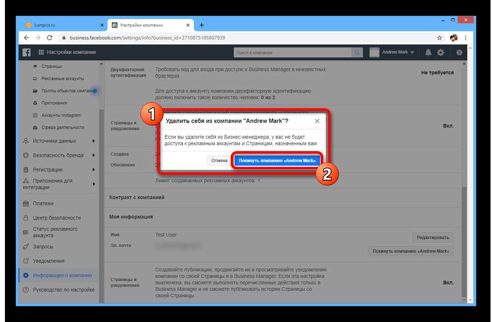Примечание: Кнопка будет недосягаема, если вы являетесь единственным админом в бизнес-менеджере.