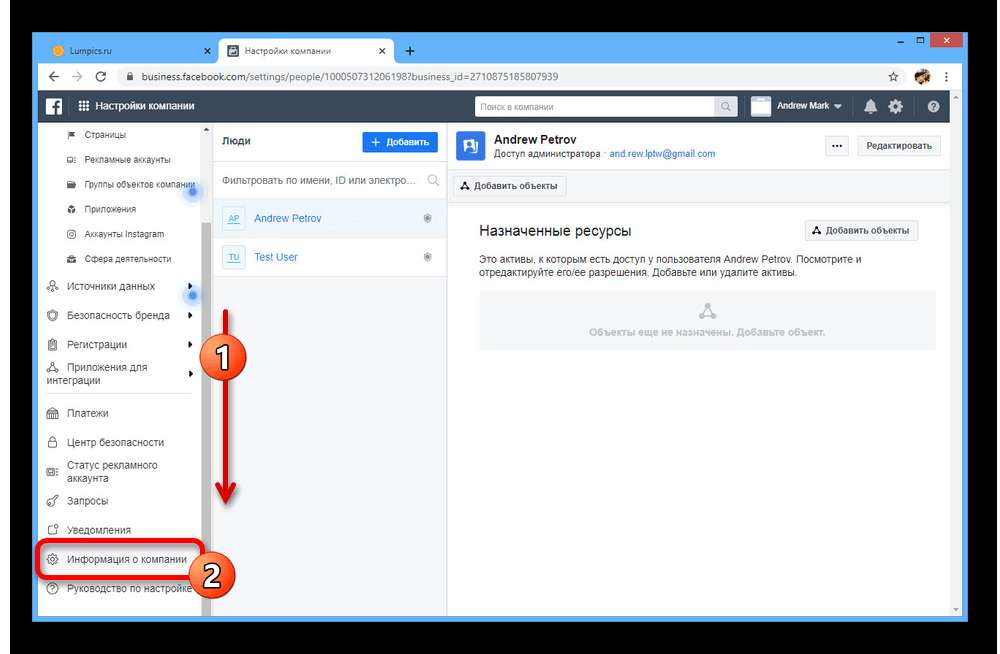 - Если вы желаете удалить бизнес-менеджер не себе, а для другого человека, придется пользоваться другим подходом. Сначала опять откройте «Настройки компании», но на этот раз изберите раздел «Люди» в блоке «Пользователи».