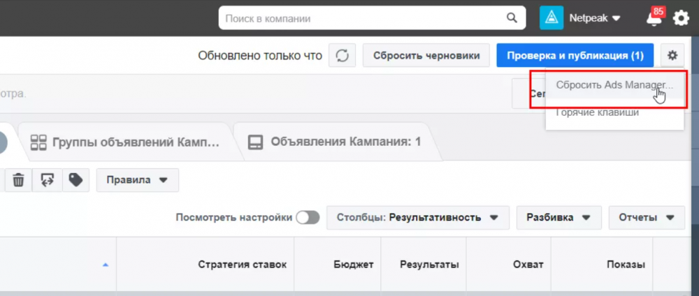 если со способами оплаты всё в порядке, кампании и группы объявлений настроены верно, используйте функцию «Сбросить Ads Manager».
