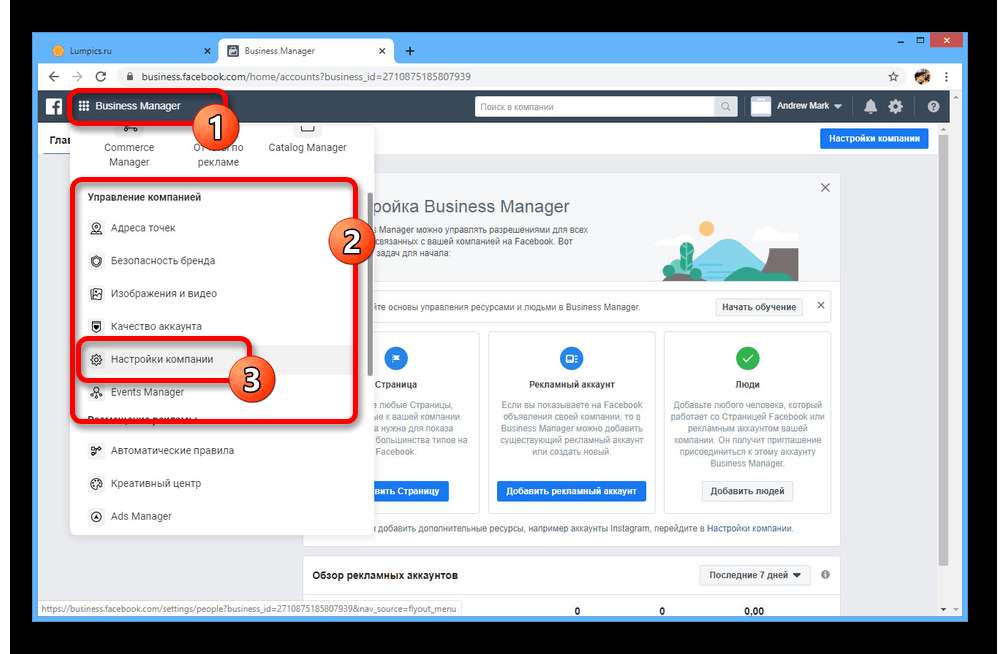 - Находясь на главной страничке бизнес-менеджера, на верхней панели кликните «Business Manager» и в блоке «Управление компанией» изберите «Настройки компании».